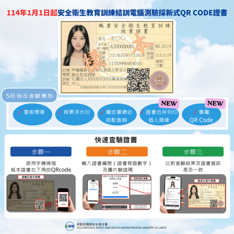 為精進職業安全衛生教育訓練結業證書防偽及查驗機制,自114年1月1日起,「職業安全衛生業務主管(含營造業)」、「營造作業主管」、「有害作業主管」及「從事勞工健康服務之護理人員及勞工健康服務相關人員」等22種採電腦結訓測驗的安全衛生教育訓練,將發給新版結業證書,統一由電腦測驗試場系統印製個人頭像及專屬QR Code,掃描QR Code即可快速查驗證書,便利事業單位管理及主管機關查核,確認證書真偽,並可減少不肖人士、單位偽造之可能性。
